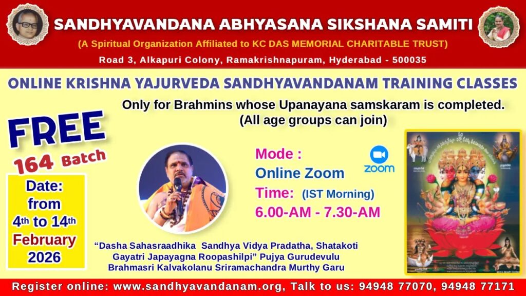 సంధ్యావందన అభ్యసన శిక్షణా సమితి ద్వారా 164 వ యజుర్వేద సంధ్యావందన శిక్షణా శిబిరం February 4, 2026 నుండి ప్రారంభం కానున్నది. 11 రోజులలో స్వర, ముద్రా సహితముగా యజుర్వేద సంధ్యావందనం సశాస్త్రీయము గా ఉపవీతులైన వారికి గురుముఖతః నేర్చుకునే మహదవకాశం. 20,000 ల మందికి పైగా సంధ్యా విద్య ని ప్రసాదించిన బ్రహ్మశ్రీ కల్వకొలను శ్రీరామచంద్ర మూర్తి గురువుగారి ఆధ్వర్యం లో “zoom” మాధ్యమం ద్వారా రోజు ప్రాతః కాలం 6:00 కు గురుముఖ పాఠం ఉంటుంది. శిబిరం లో భాగం గా వేద స్వరం, ముద్రల లో ని తప్పులు దిద్దటం, ధార్మిక సందేహాల నివృత్తి కూడా చేయబడతాయి.