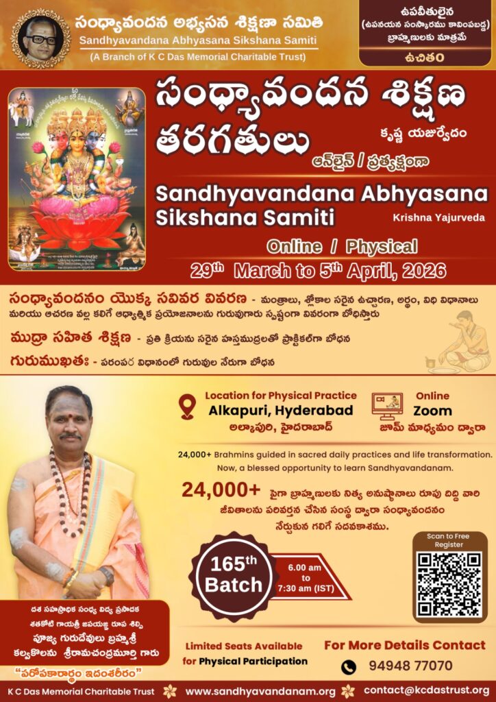 సంధ్యావందన అభ్యసన శిక్షణా సమితి ద్వారా 165 వ యజుర్వేద సంధ్యావందన శిక్షణా శిబిరం March 29, 2026 నుండి ప్రారంభం కానున్నది. స్వర, ముద్రా సహితముగా యజుర్వేద సంధ్యావందనం సశాస్త్రీయము గా ఉపవీతులైన వారికి గురుముఖతః నేర్చుకునే మహదవకాశం. 20,000 ల మందికి పైగా సంధ్యా విద్య ని ప్రసాదించిన బ్రహ్మశ్రీ కల్వకొలను శ్రీరామచంద్ర మూర్తి గురువుగారి ఆధ్వర్యం లో “zoom” మాధ్యమం ద్వారా రోజు ప్రాతః కాలం 6:00 కు గురుముఖ పాఠం ఉంటుంది. శిబిరం లో భాగం గా వేద స్వరం, ముద్రల లో ని తప్పులు దిద్దటం, ధార్మిక సందేహాల నివృత్తి కూడా చేయబడతాయి.