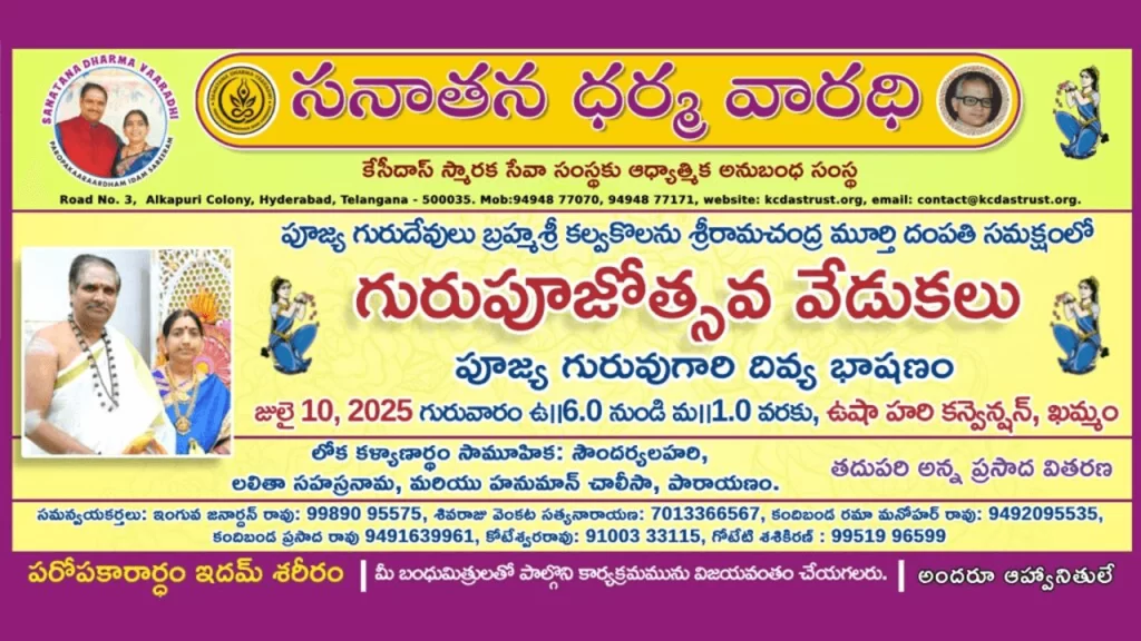 అందుకే మనం ఈ పౌర్ణమికి మన పూజ్య గురువు బ్రహ్మశ్రీ కల్వకొలను శ్రీరామచంద్రమూర్తి గారిని సాక్షాత్తు వ్యాస రూపంలో 10/7/25 గురువారం ఉ.6.00 నుంచి మ.1.00 వరకు