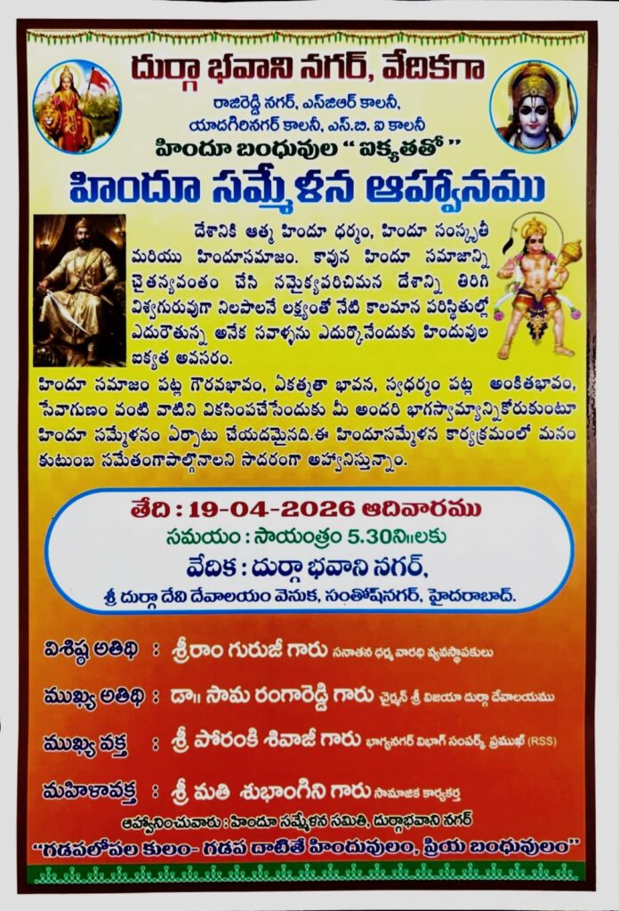 RSS వారి శత జయంతి ఉత్సవాలలో భాగంగా ఆదివారం(ఏప్రిల్19వ తేదీ) సాయంత్రం, సంతోష్ నగర్ లో మన గురువుగారు ధర్మాచార్య శ్రీరాం గురూజీ(కల్వకొలను శ్రీ రామ చంద్ర మూర్తి గారు) విశిష్ఠ అతిథిగా హాజరై హిందూ ధర్మ పరిరక్షణ పై ప్రసంగం చేయనున్నారు. సంస్థ సభ్యులందరూ పెద్ద ఎత్తున పాల్గొనవలసిందిగా కోరుచున్నాము….